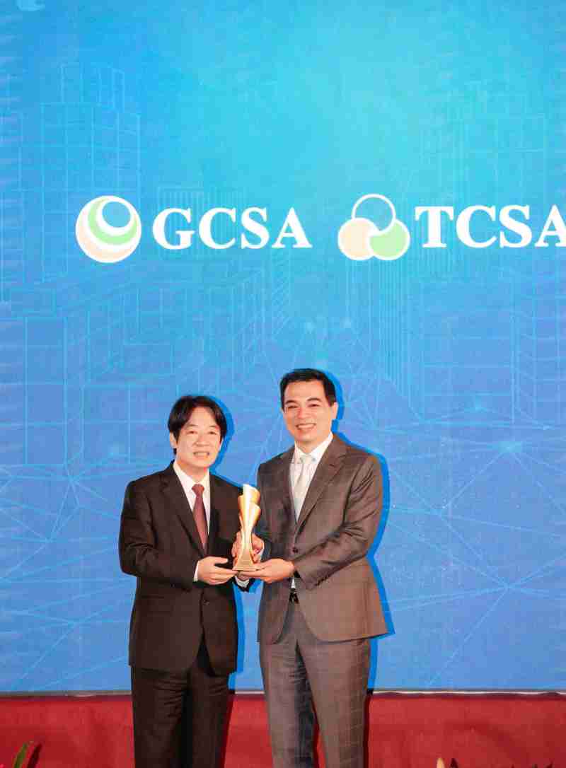 达全方位永续表现获全球永续奖及台湾永续奖肯定,,由副总统赖清德颁奖 (左),,银河集团总经理柯富仁 (右) 代表领奖