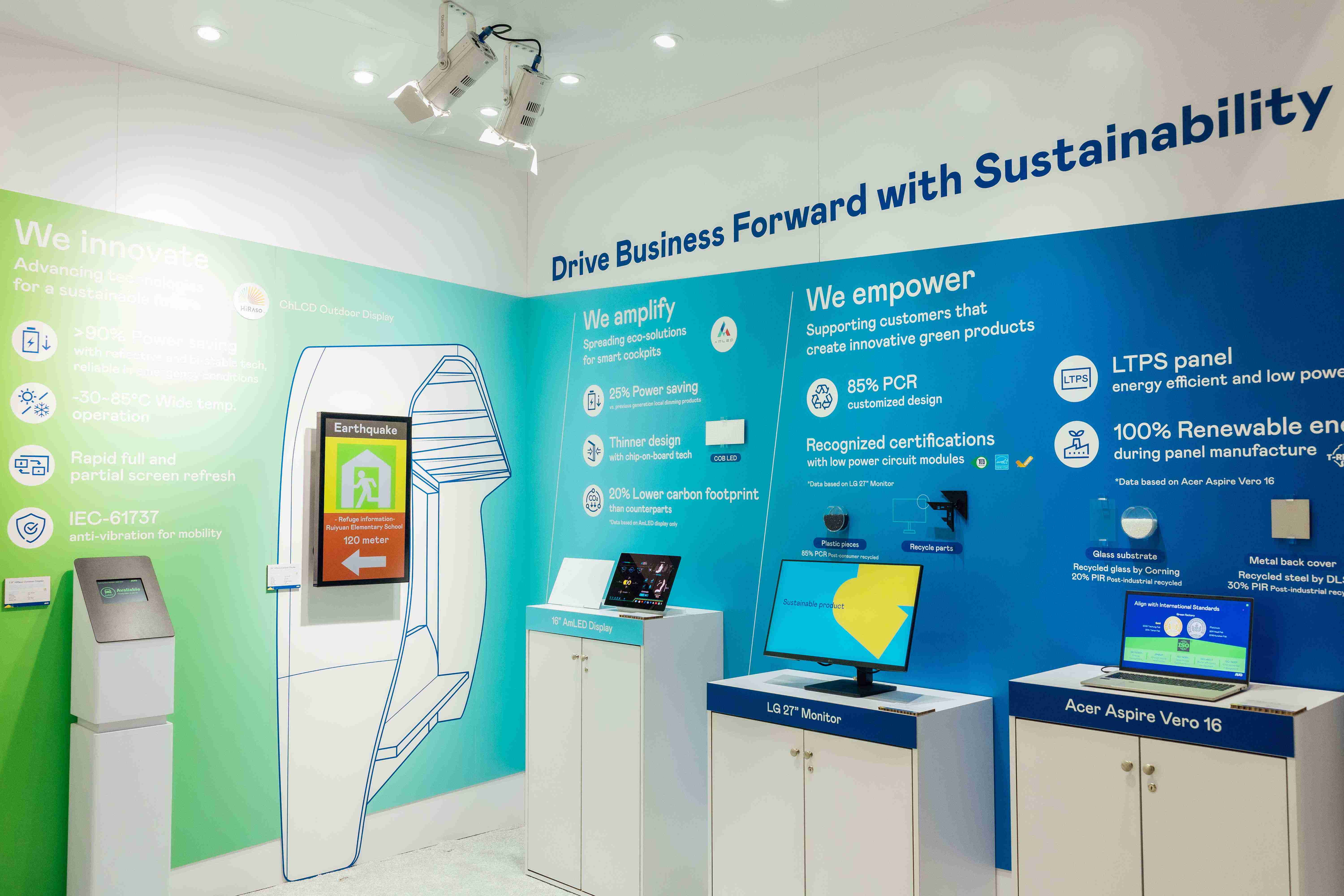 银河集团运用创新显示技术HiRaso胆固醇液晶双稳态技术达到显示零耗能、、扩大节能省电的AmLED显示技术应用于车用产品、、、、以再生的消费后回收(PCR)塑料及全绿电生产之面板,,应用于笔电及萤幕,,,,增加绿色价值。。。