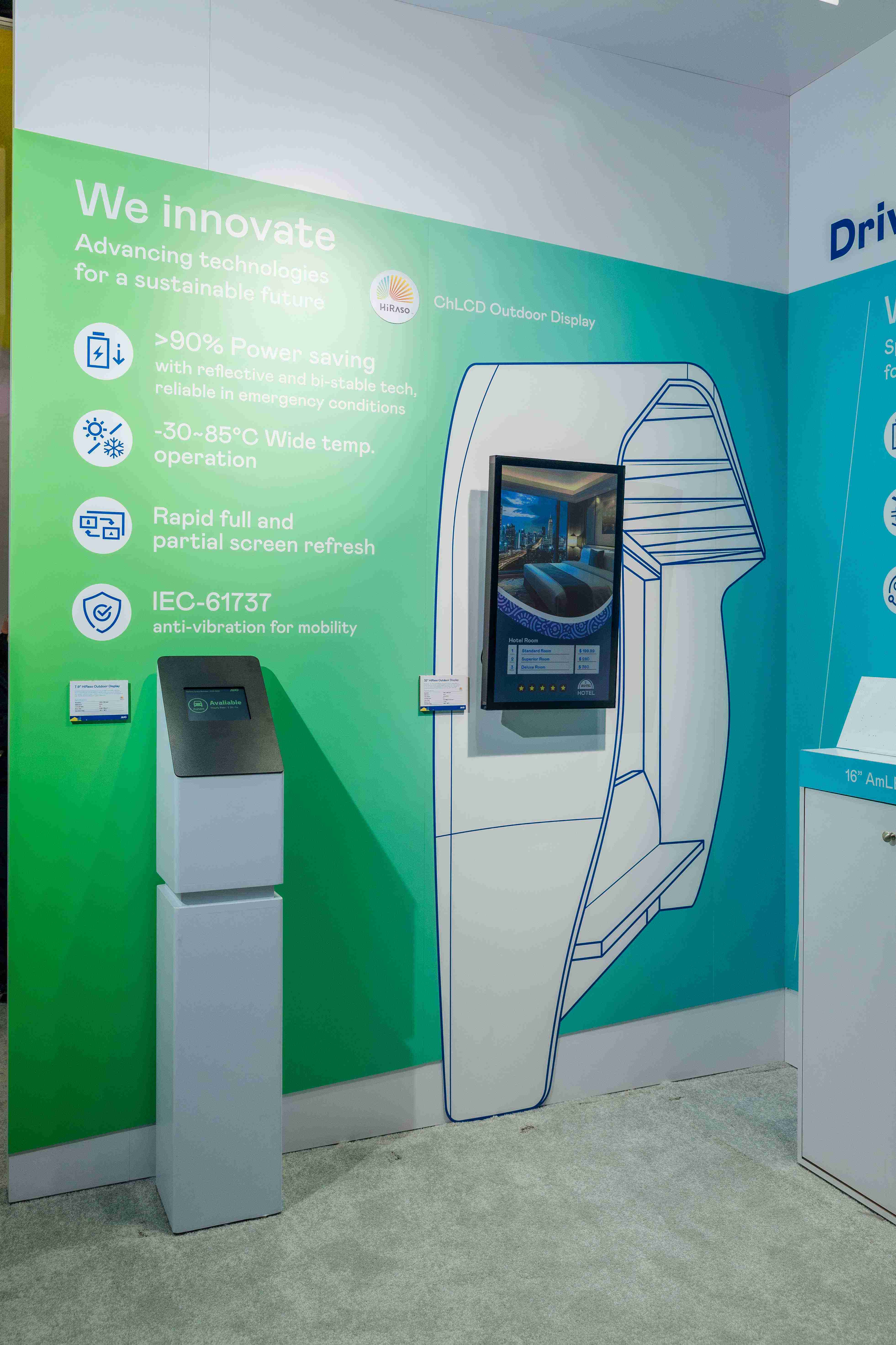 HiRaso胆固醇液晶显示器运用反射环境光线的方式,,,呈现影像显示时零耗能的环保省电诉求,,光线愈强愈能呈现绝佳的色彩饱和度及显示效果,,同时在摄氏-30度至85度间宽温的使用优势,,,为户外电子看板的新首选。。。