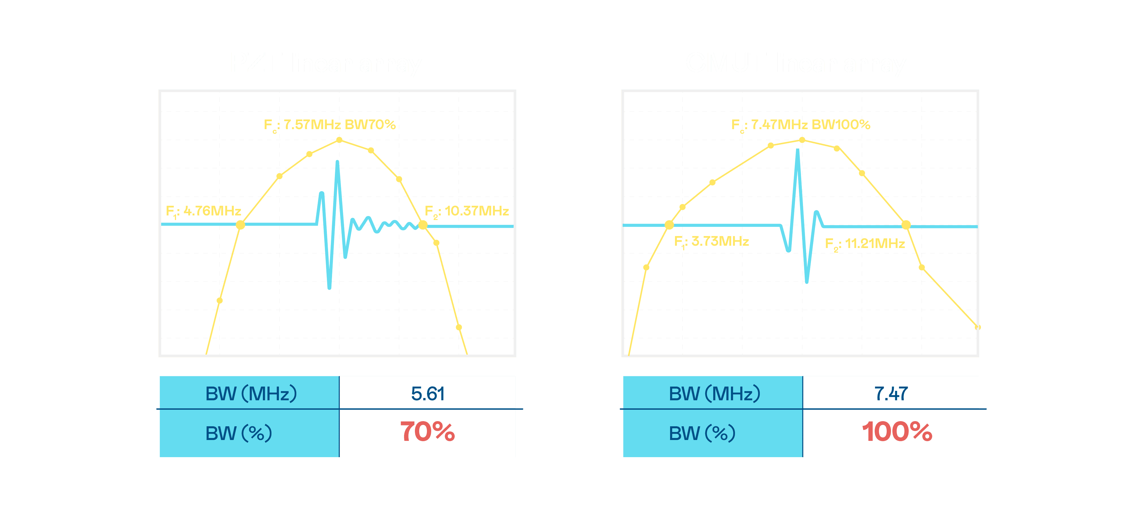 超音波影像的解析度高低,,首先取决于探头能发出的讯号频宽。。。。银河集团 CMUT 可提供高清晰的超音波讯号,,,提供高频宽、、、高灵敏度、、影像纹理细节更高的超音波影像,,,,协助医护人员缩短影像判读时间及利用精准的医疗影像进行诊断。。